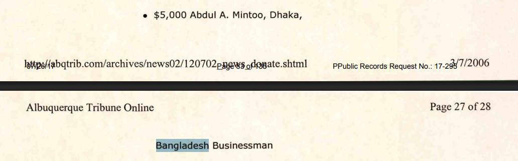 নথিগুলো বিশ্লেষণ করে দেখা গেছে, নিউ মেক্সিকোর প্রাক্তন গভর্নর বিল রিচার্ডসনের নির্বাচনী প্রচারণায় অর্থ প্রদানকারী তালিকায় বাংলাদেশের ব্যবসায়ী ও বিএনপি নেতা আব্দুল আউয়াল মিন্টুর নাম অন্তর্ভুক্ত ছিল। তিনি ওই প্রচারণার জন্য ৫ হাজার মার্কিন ডলার অনুদান দিয়েছিলেন।