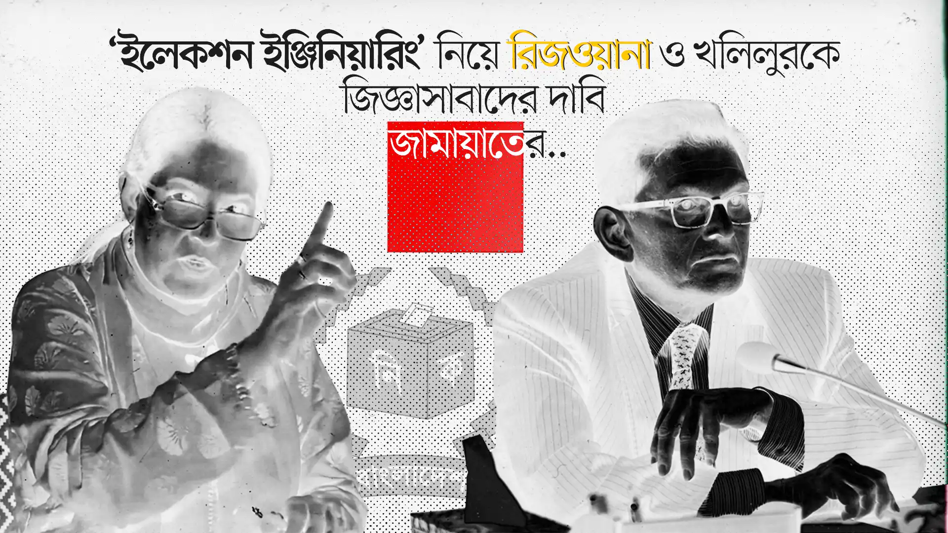 বাংলাদেশ জামায়াতে ইসলামী দাবি করেছে, অন্তর্বর্তীকালীন সরকারের প্রাক্তন উপদেষ্টা সৈয়দা রিজওয়ানা হাসান এবং প্রাক্তন নিরাপত্তা উপদেষ্টা খলিলুর রহমান, যিনি বর্তমানে দেশের পররাষ্ট্রমন্ত্রী হিসেবে দায়িত্ব পালন করছেন, তাদের ‘ইলেকশন ইঞ্জিনিয়ারিং’ বা নির্বাচনী প্রকৌশলের অভিযোগে জিজ্ঞাসাবাদ করা হোক এবং বিচারের মুখোমুখি করা হোক।